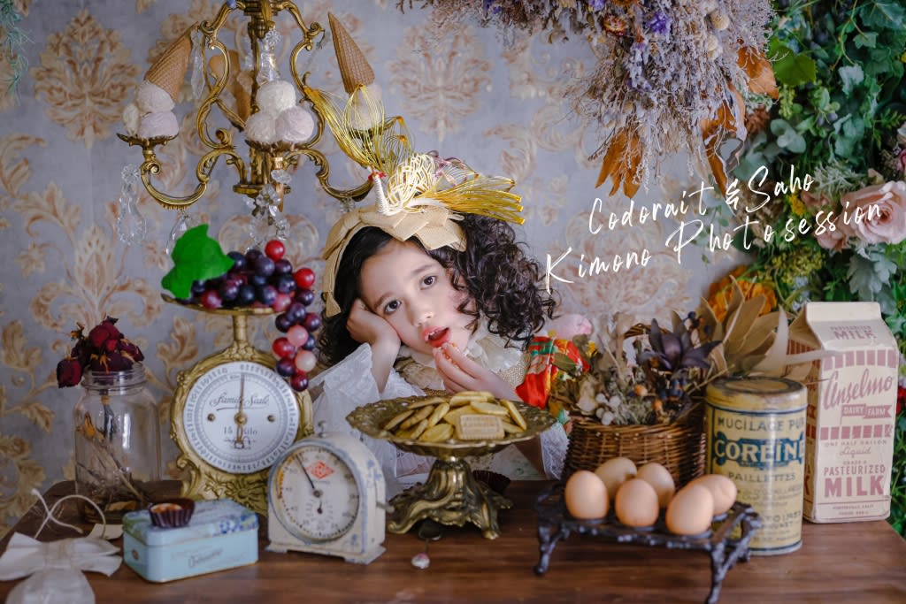 名古屋のウェディングドレスデザイナーが営むキッズブランドcodoraitが買い付けたアンティーク着物に、オリジナルのコーディネートする撮影会です。